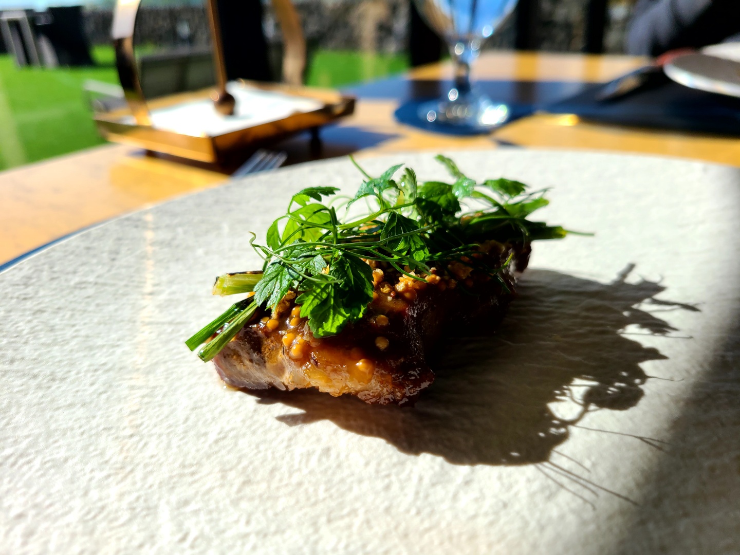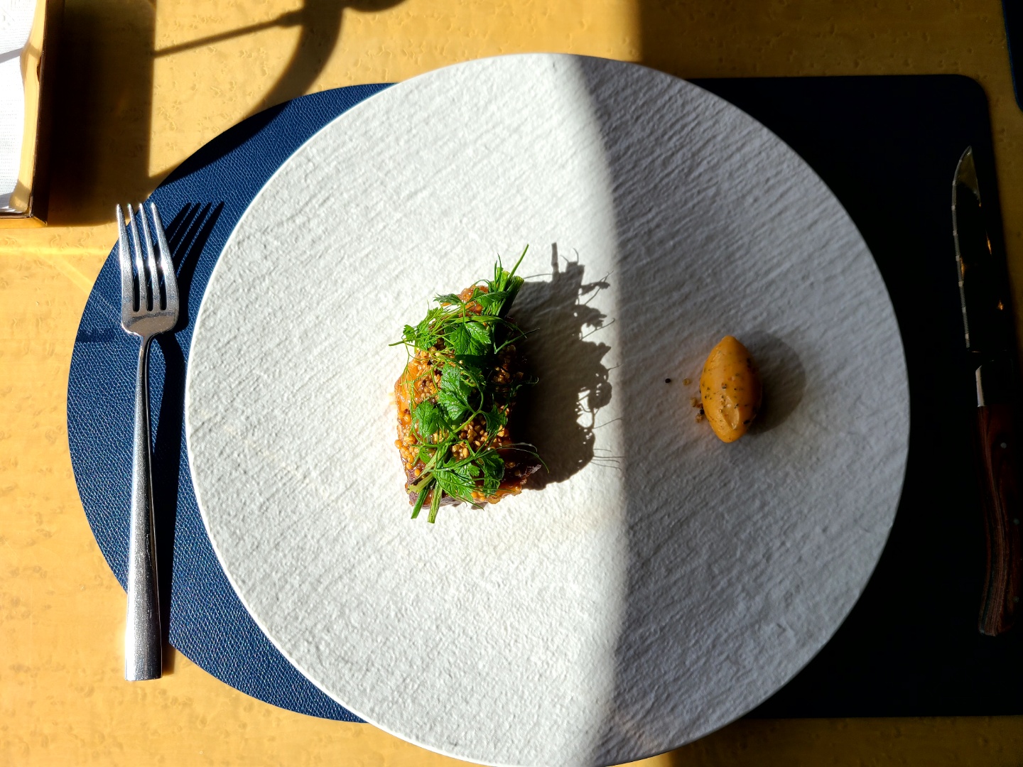 메인 디쉬로는 이베리코 베요타 스테이크가 나왔다. 스테이크 위에 소스와 메밀 등 여러가지 채소가 올려져 있다. 그 옆에 노란색 럭비공 모양은 매콤한 마늘 버터이다. 매콤하다고 적혀는 있으나, '맵찔이'인 필자의 기준으로도 전혀 맵지 않았다. 개인적인 생각으로는, 만약 정말 더 매콤하였다면 음식 분위기를 깼을 것 같다는 생각이 들었다. 스테이크는 꽤 두꺼웠고, 겉보기에도 아주 기름이 풍부하여 맛있을 것 같았다. 그리고, 창 밖에서 은은히 들어오는 자연광이 플레이팅을 완성하여 음식의 풍미를 더욱 높여준 느낌이 들었다.
