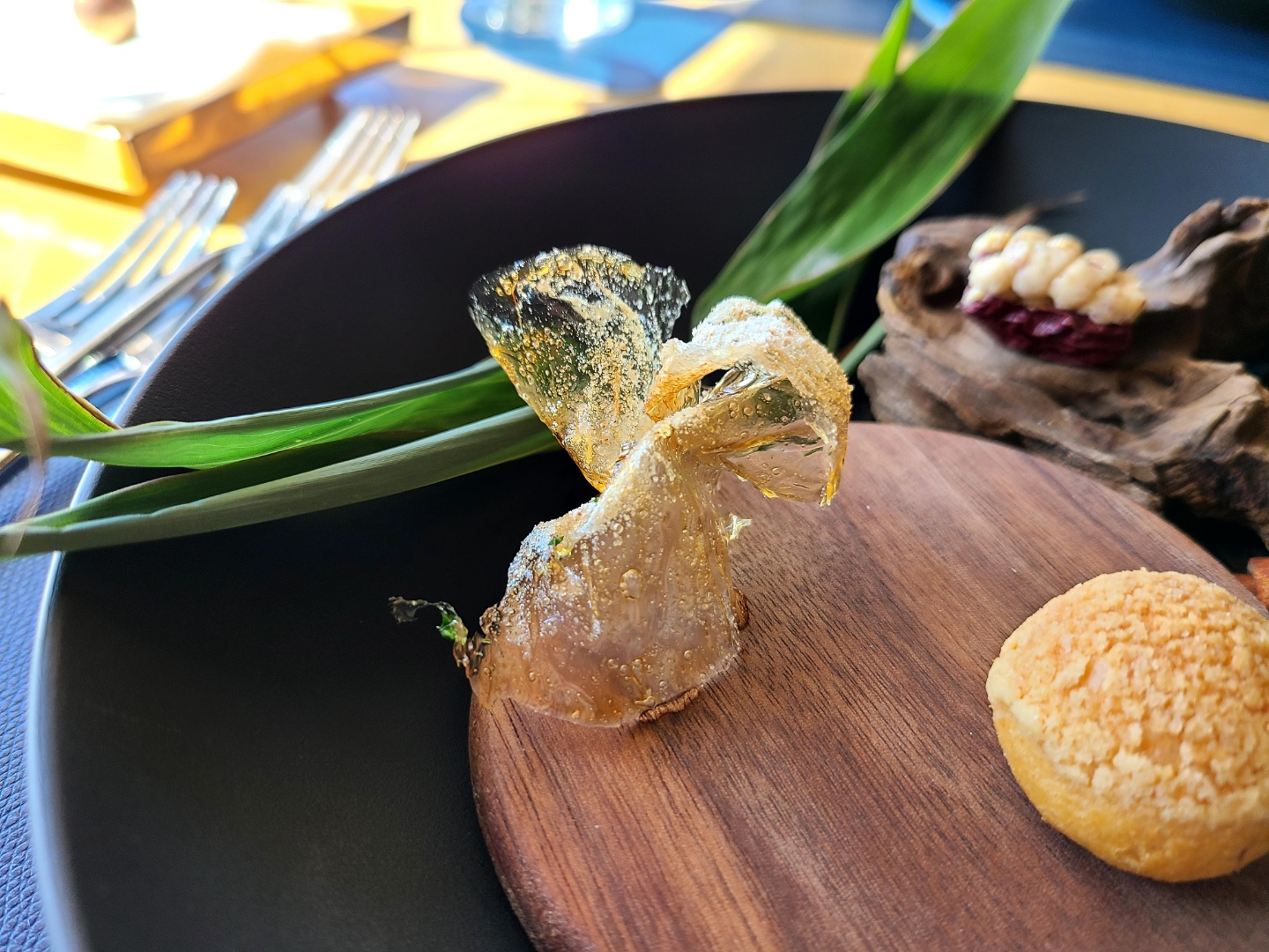 감자를 얇게 가공하여, 투명하게 만든 요리이다. 설명을 들었었는데, 이 정도까지 밖에 기억에 남지 않는다. 맛은 굉장히 오묘하였다. 감자칩같은 맛인데, 식감은 김부각에 조금 더 가까우나 훨씬 바삭하며 고소하였다. 다만, 내 입맛에는 조금 짠 부분이 있었다. 소금 간 조절이 조금 잘못된 듯싶은데, 음식의 밸런스를 깰 정도는 아니었던 것 같다.