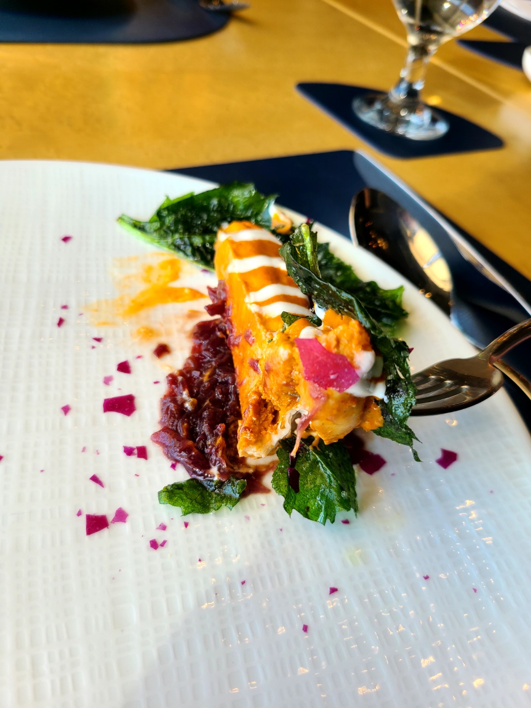 아까 든 무거운 느낌을 딱 날려줄 아주 적절한 음식이 나왔다. 맨 위에 올려져 있는 것은 애플민트이고, 블루베리와 레드 와인이 스며든 살얼음 디저트이다. 굉장히 입 안을 상쾌하게 해 주었다. 평소 블루베리와 와인, 애플민트 모두를 좋아하여, 너무 즐겁게 먹었던 것 같다. 너무 달지도 않고 정말 적절했다. 다음 요리를 준비하기에 적절한 음식이었다고 생각한다.